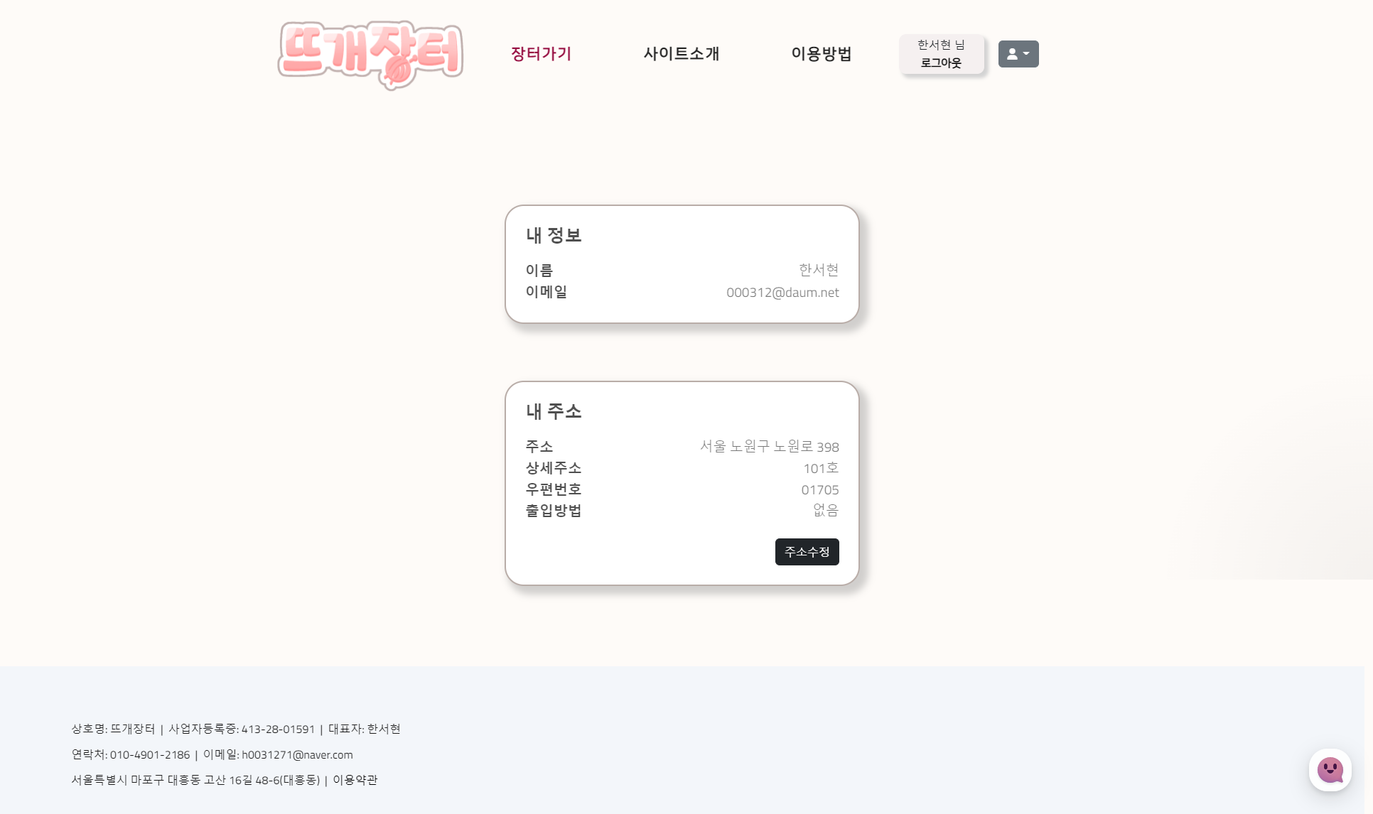 - 내 주소 등록 / 수정 가능 (카카오 우편번호 API)