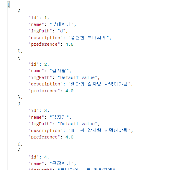 DB μ μ μ₯λ μ°κ° λͺ©λ‘μ€μμ λλ€μΌλ‘ 1κ°μ§λ§ κ°μ Έμ€λ λ©μλ getRandomJjigae() λ₯Ό λ§λ€μ΄λ³΄κ² λ€. 1. λͺ¨λ μ°κ° μ 보 κ°μ Έμ€κΈ° 2. μ°κ°μ Idλ§ List μ λ΄κΈ° 3. List μ λ΄κΈ΄ id μ€ λλ€μΌλ‘ 1κ° κ³ λ₯΄κΈ° (