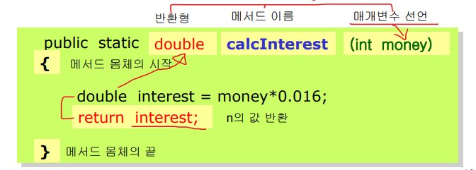 - retrun 해주는 결과값(변수)의 자료형을 메서드 이름 앞에 써준다