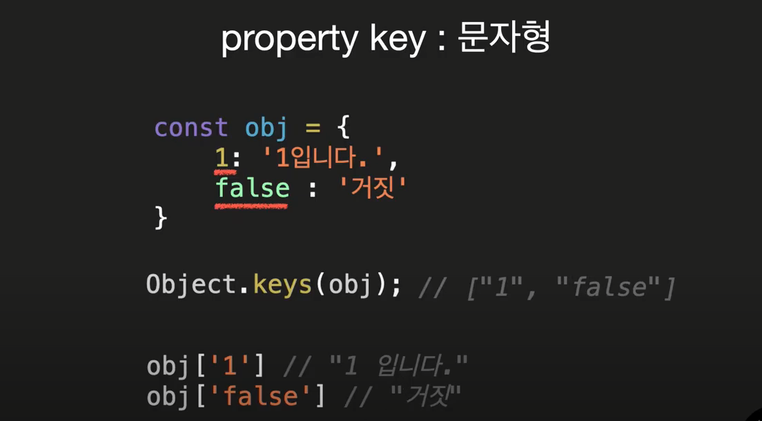 Object.keys(obj) 로 접근하면 문자열로 리턴이 된다 ["1", "false"]