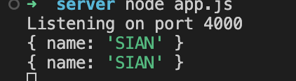 그 다음 localhost : 4000 에 접속을 하면 콘솔에 로그만 찍히고 페이지 접속이 되지않는다.
