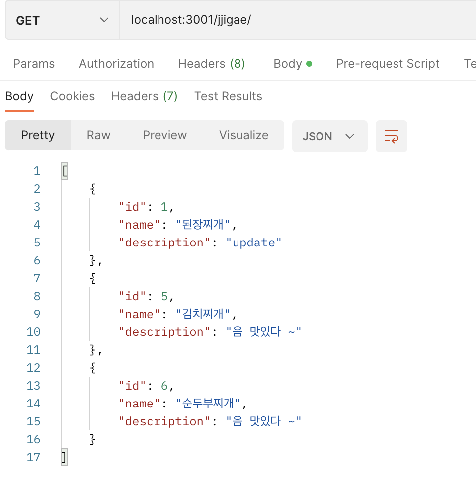 JJIGAE 테이블의 모든 데이터를 가져오는 메서드이다.