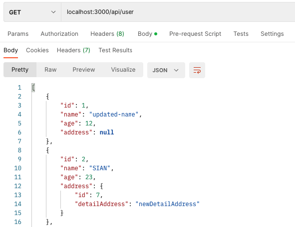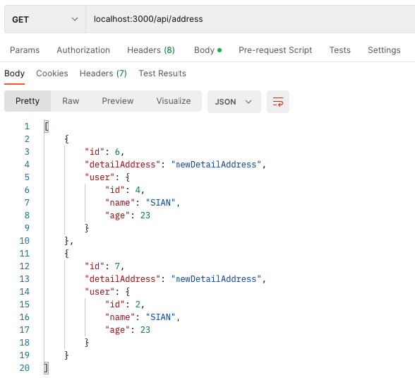양방향 매핑을 해서 User 에서도, Address 에서도 서로를 조회 할 수 있게되었다.