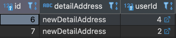 관계의 주인 Address 가 User의 pk 값을 fk 로 갖고 있는 것을 확인할 수 있다.