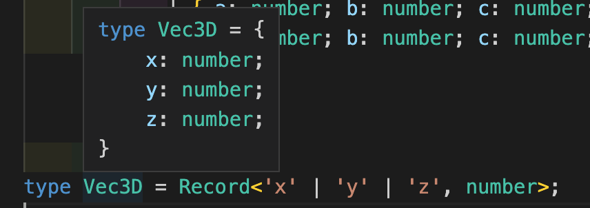 type Vec3D = Record<'x' | 'y' | 'z', number>; //Vec3D 객체의 속성 이름은 x,y,z 이고, 값은 number 타입이다