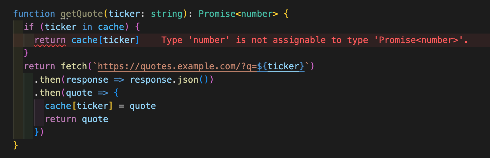 따라서 if 구문에는 cache[ticker] 가 아니라 Promise.resolve(cache[ticker]) 가 반환되는 것이 옳다. 근데 ! 함수에서 오류를 발생시키고 있지 않다. 왜냐하면 타입을 명시해주지 않았기 때문에 ~