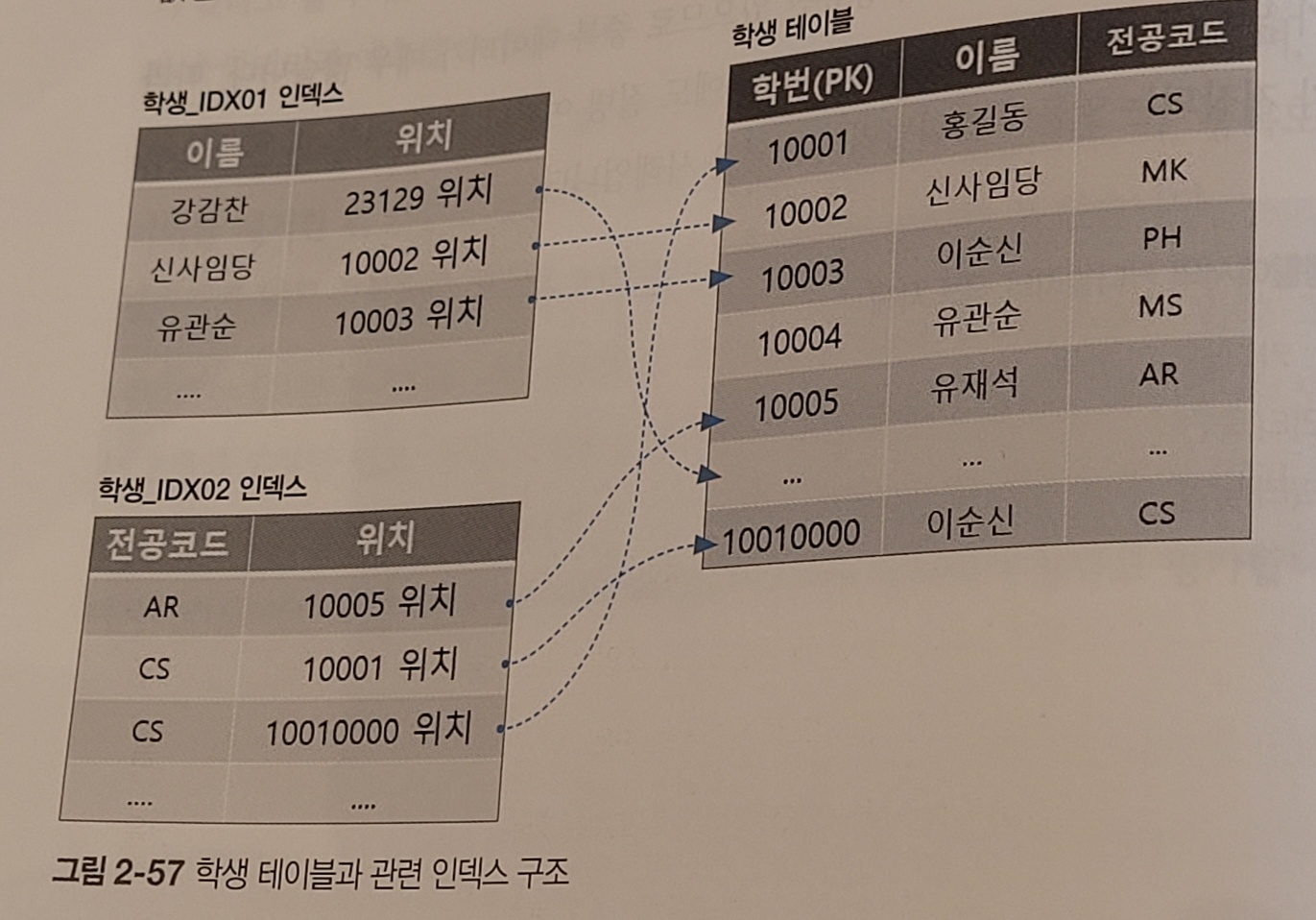 각 인덱스는 아래 그림과 같은 물리적 구조로 생성되며, 이때 인덱스의 각 행이 테이블의 기본키(PK : 학번) 값을 가리킨다.