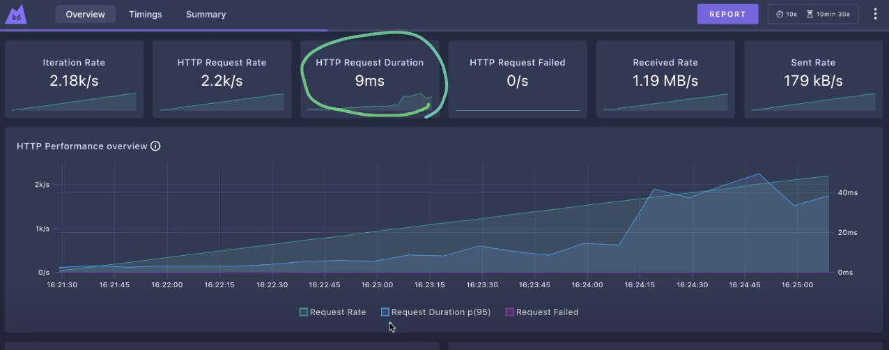 - http_reqs : 1μ΄λΉ 1300κ°μ μμ²μ μ²λ¦¬νκ³ μλ€λ λ» (= Throughput 1300)