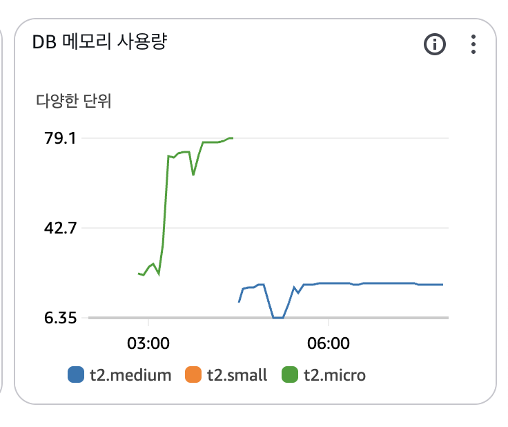 - DB 인스턴스를 t2.micro 에서 t2.medium 으로 변경 후 79%이던 DB메모리 사용량이 20% 이하로 떨어진 것을 확인할 수 있다.