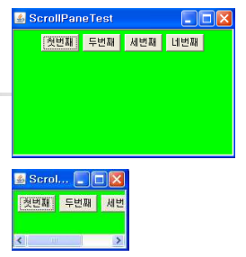- 포함된 컴포넌트의 크기가 ScrollPane 자신보다 큰 경우 스크롤바를 이용해서 볼 수 있게 해줌