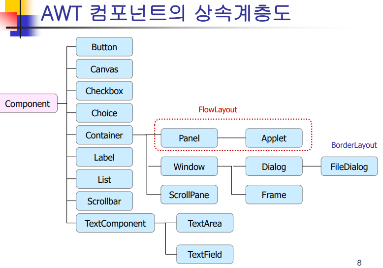 ▶ AWT 구현순서 : 반드시 Container 가 제일 밑에 깔리고 그 위에 Component 가 올라와야 함