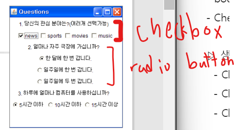 - TextArea(int row, int col) : scrollbar 는 수평, 수직 모두 갖는다