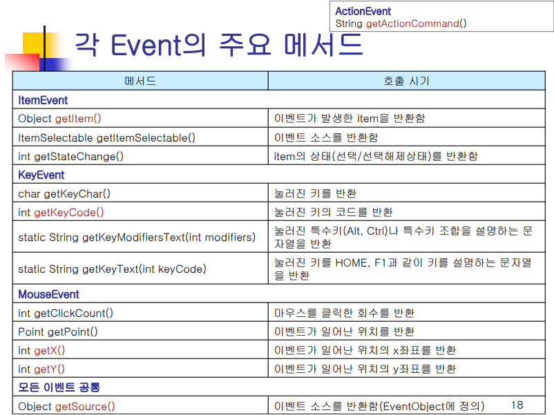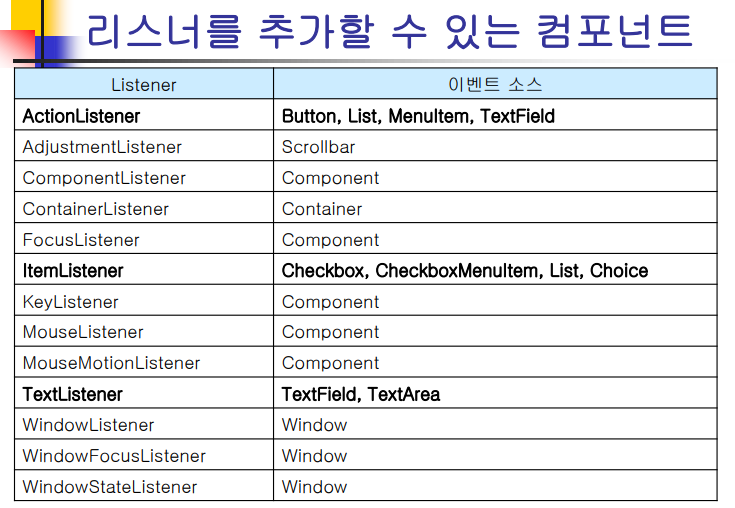 ex ) 사용자가 마우스를 움직이거나 클릭할 때, 키보드를 눌렀을 때, Frame의 크기를 변경할 때 이벤트 발생