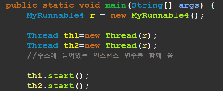 main 에서 Thread 인스턴스를 2개 생성하고 같은 주소값을 넣어주면