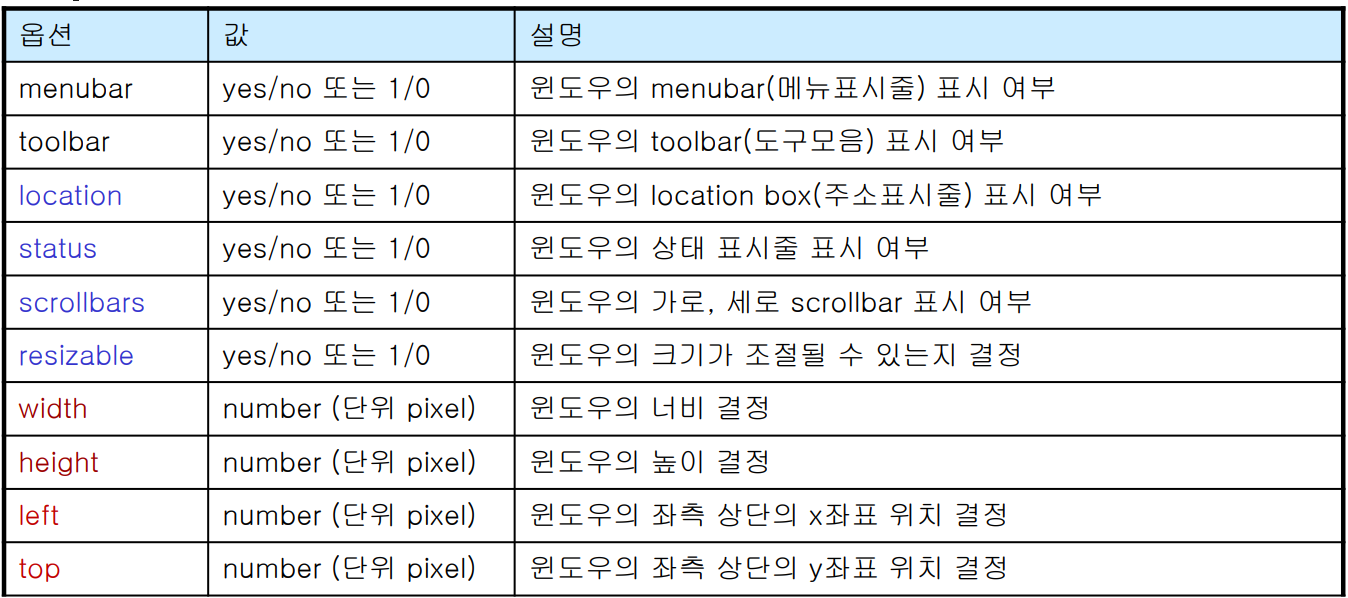 창이름 – 새로 생성되는 창의 이름을 지정하는 것 ( html문서의 target )