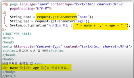 getParameter 로 받은 값을 <% %> 안에 넣어서 브라우저에 다시 돌려주게 되는 것