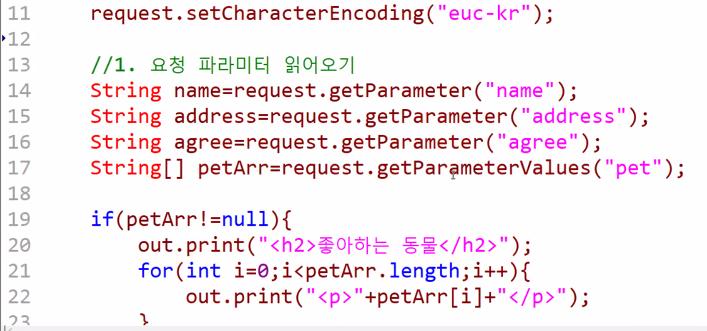 - request 기본 객체는 웹 브라우저가 전송한 파라미터를 읽어올 수 있는 메서드 제공