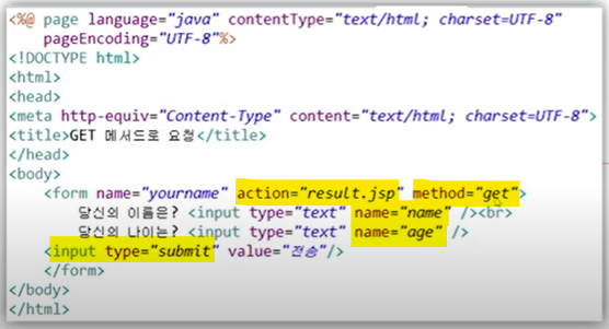 전송버튼을 누르면 form 태그의 속성중에서 action에 지정되어있는 result로 요청을하게됨 (값은 서버로 감)