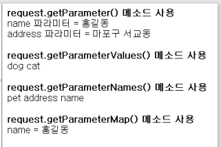 String getParameter(name) : 이름이 name인 파라미터에 할당된 값을 리턴하며,