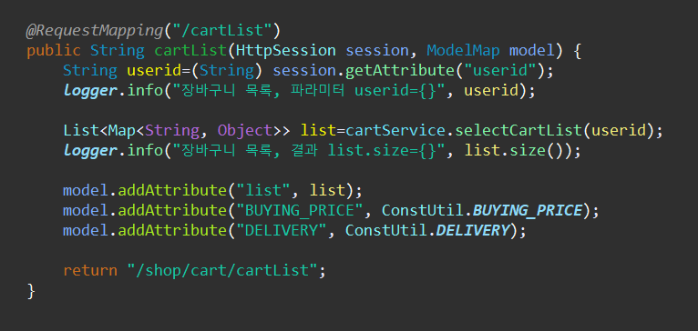 list , 배송비, 기준구매금액을 model 에 addAttribute로 담아서 cartList 로 보낸다