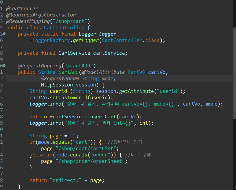 파라미터 mode 가 cart 면 cartList 로 redirect 해서 장바구니 리스트를 보여주고,